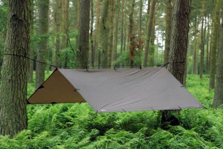It’s a super tough coated polyester with a good 3000PU water resistance and as you can see in the photo, has lots of solid attachment points so this will gives very usable dry ‘camp’ area below and around your hammock position.