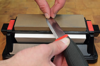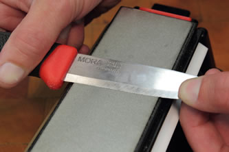 These Mora knives are easy to keep a good edge and can be sharpened like this – Shown below: using a Lansky Sharpener Tri Stone Bench Stone. If you keep your blade clean and strop regularly, you wont have any problems with this knife.